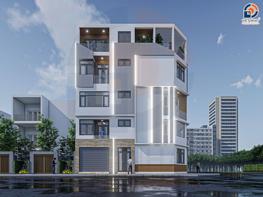 1. Hình ảnh thiết kế 3D công trình nhà phố 4 tầng 2 mặt tiền vát góc Anh Trung Gò Vấp