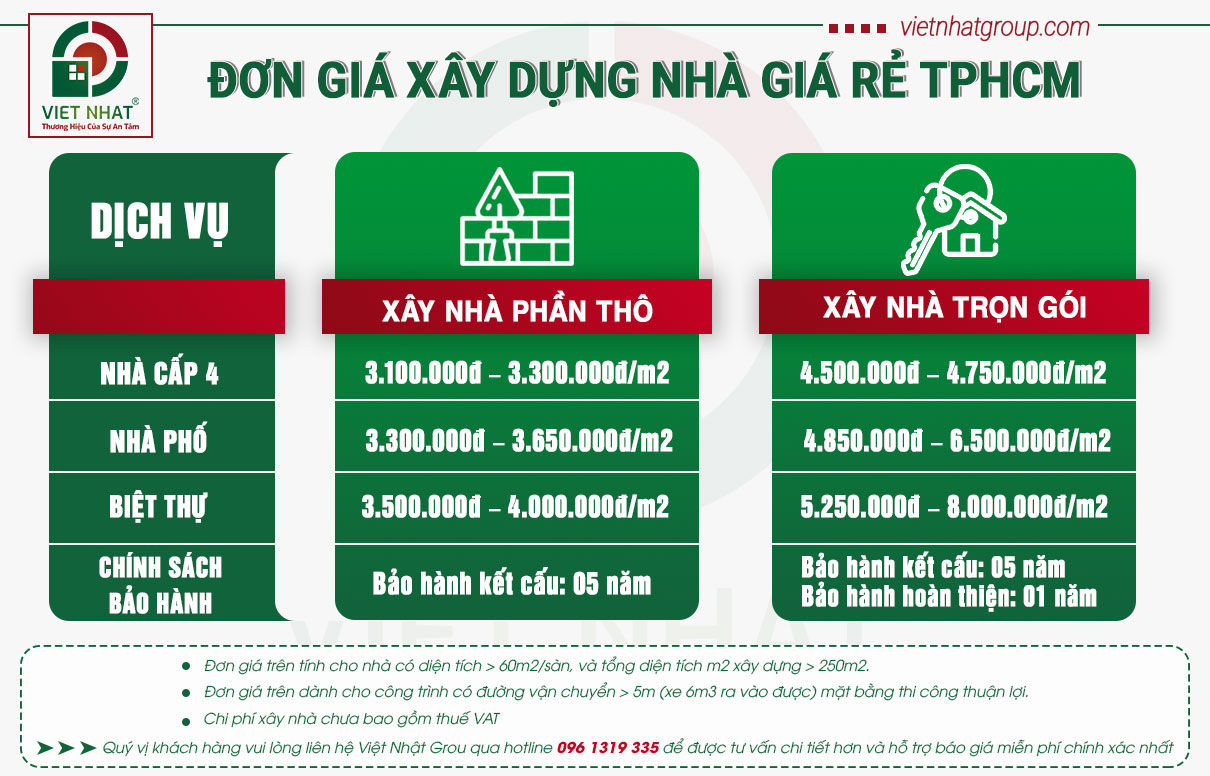 Hiện nay, trên thị trường xây dựng có rất nhiều công ty, nhà thầu xây dựng khác nhau cho Quý vị lựa chọn. Nhưng để Quý vị có thể dễ dàng tìm kiếm được đơn vị phù hợp, dưới đây Việt Nhật Group xin đưa ra thông tin bảng giá dịch vụ xây nhà giá rẻ tphcm như sau: